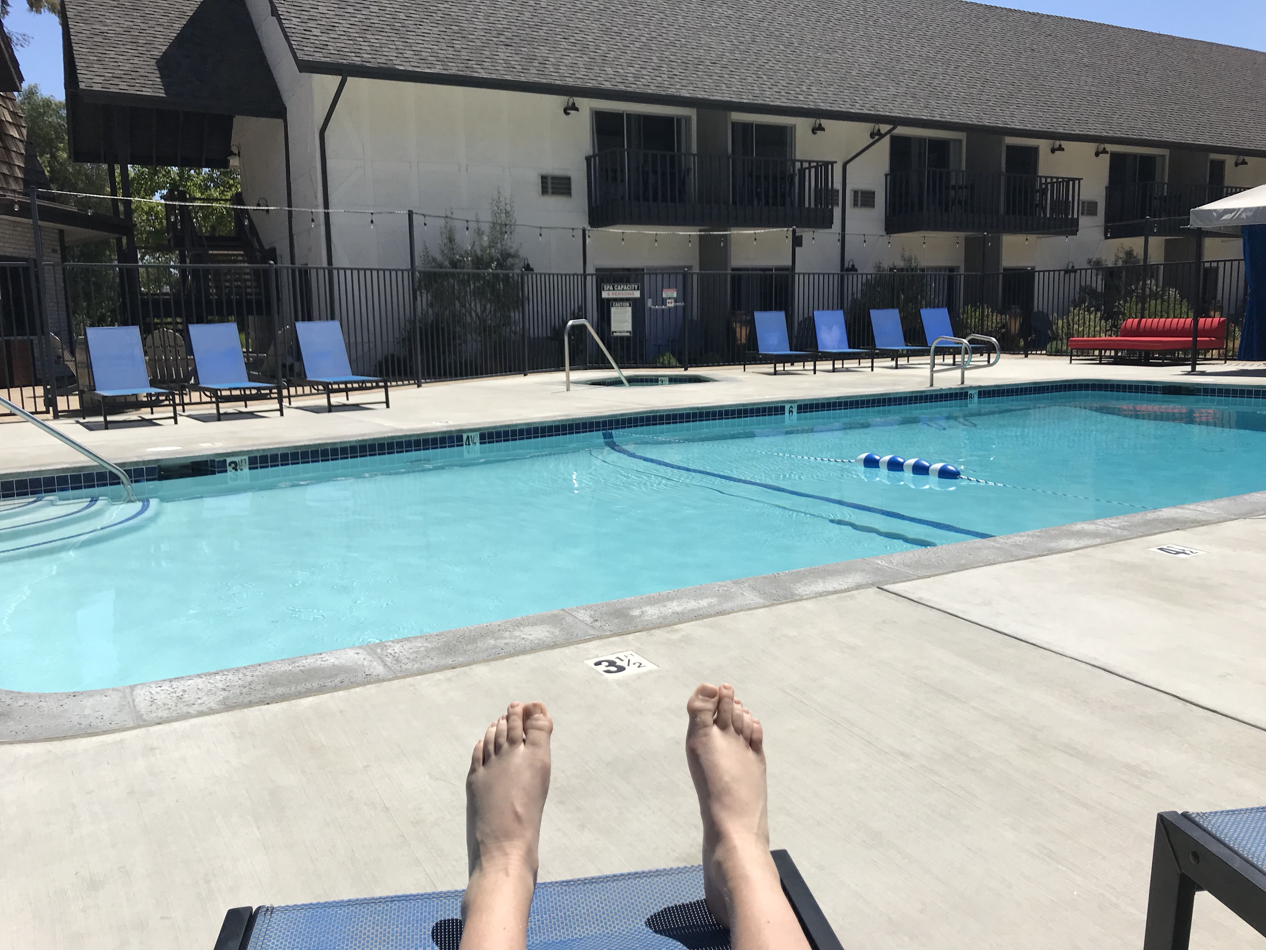 Ponille käyty antaan liikuntaa ja kattelemassa viinitiloja. Kierros Solvang – Santa Ynez – Los Olivos ja nyt altaalle. Aurinko paistaa ja lämmintä 25, kyllä kelpaa.